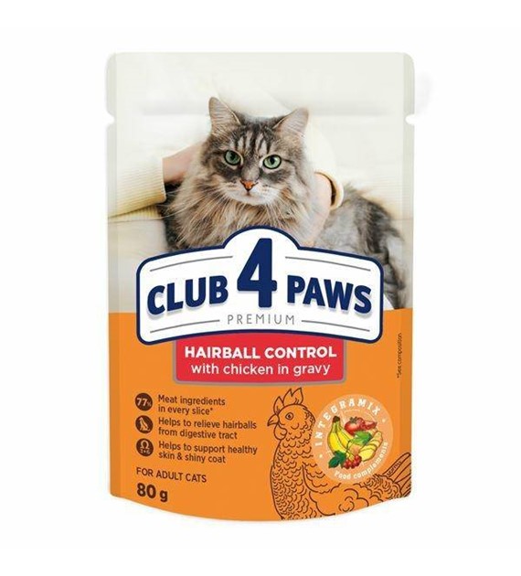CLUB 4 PAWS PREMIUM PEŁNOWARTOŚCIOWA MOKRA KARMA DLA DOROSŁYCH KOTÓW ELIMINACJA KUL WŁOSOWYCH Z PRZEWODU POKARMOWEGO – KURCZAK W SOSIE