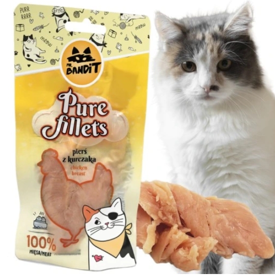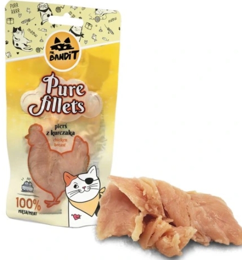 Mr. Bandit Pure Fillets to kocie delicje stworzone dla najbardziej wymagających łasuchów. Te soczyste kąski z czystej piersi kurczaka to doskonałe połączenie smaku i jakości. Każdy kęs to uczta, która spełni oczekiwania nawet najbardziej wybrednych kocich podniebień. Pozwól swojemu kotu rozkoszować się smakiem!