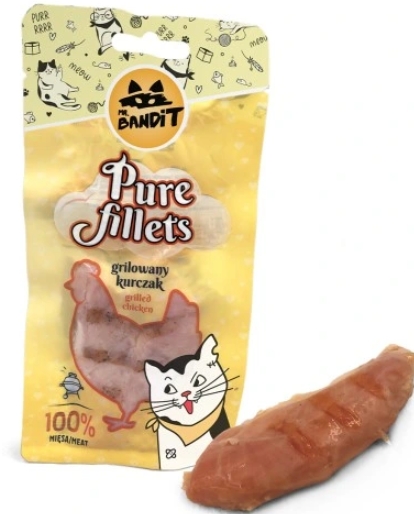 Mr. Bandit Pure Fillets to kocie delicje stworzone dla najbardziej wymagających łasuchów. Soczyste mięsne kąski z aromatycznego, grillowanego kurczaka to prawdziwy rarytas. Pozwól swojemu kotu rozkoszować się smakiem!