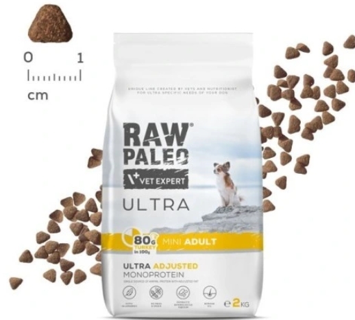 Karma Raw Paleo Ultra Mini Adult Turkey to kompletna karma dla dorosłych psów (powyżej 1. roku życia) ras małych (poniżej 8 kg masy ciała). Produkt ten jest hipoalergiczny i monoproteinowy, co oznacza, że zawiera tylko jedno źródło białka zwierzęcego (indyk), oraz posiada dopasowane do białka źródło tłuszczu (tłuszcz indyczy). Jego receptura nie zawiera grochu ani zbóż. Dodatkowo, wzbogacona jest o olej z ogórecznika, który wspomaga zdrowie skóry i sierści. Karma zawiera także probiotyk Enterococcus faecium, który wspiera prawidłową mikrobiotę jelitową, oraz proces trawienia i wchłaniania składników odżywczych.