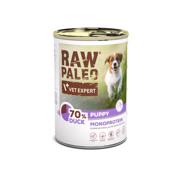 Raw Paleo Puppy Duck to karma mokra dla psów rosnących.